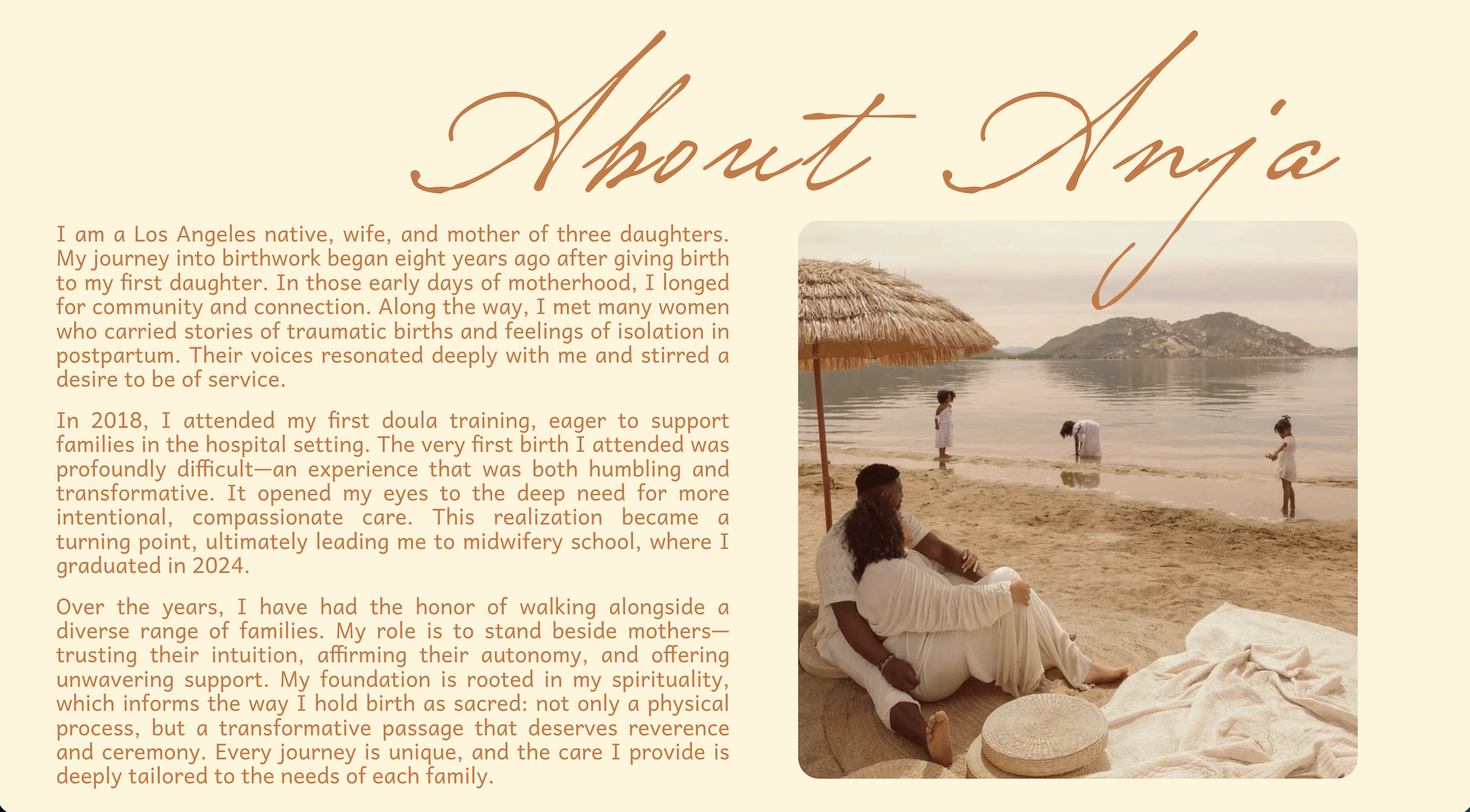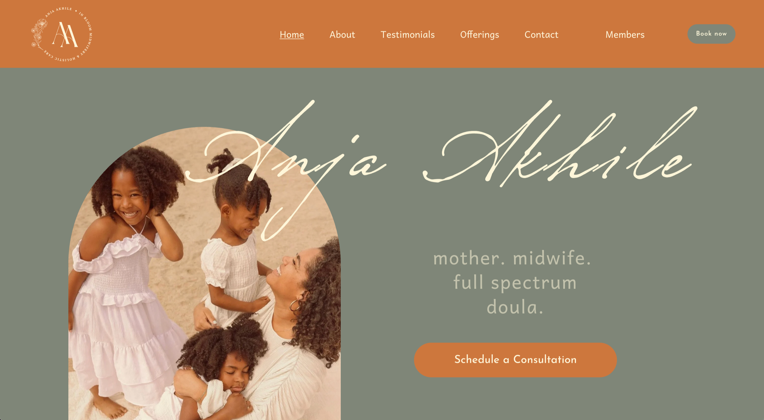 A bold, stunning one-page site for a midwife and doula who loves earth tones and flowers. Designed the logo, developed the site and made a members-only login area with an online library of resources so the client could expand her support and offerings.